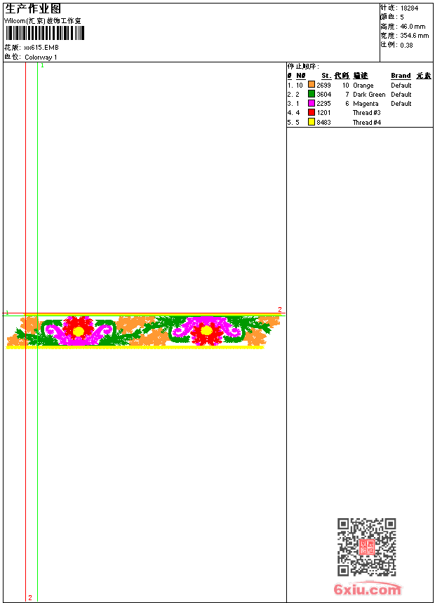 - emb花版参数: 大小:105.50 KB / 尺寸:355*46[毫米] / 针数:18284针 / 线色:5 / 格式:emb / 版本:9