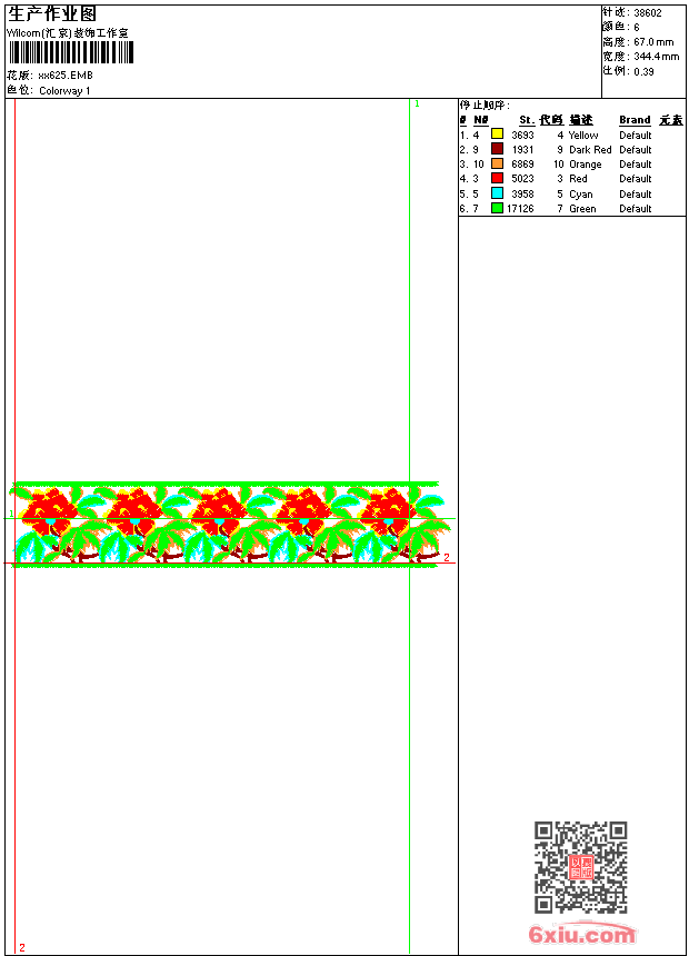 - emb花版参数: 大小:95.00 KB / 尺寸:344*67[毫米] / 针数:38602针 / 线色:6 / 格式:emb / 版本:9