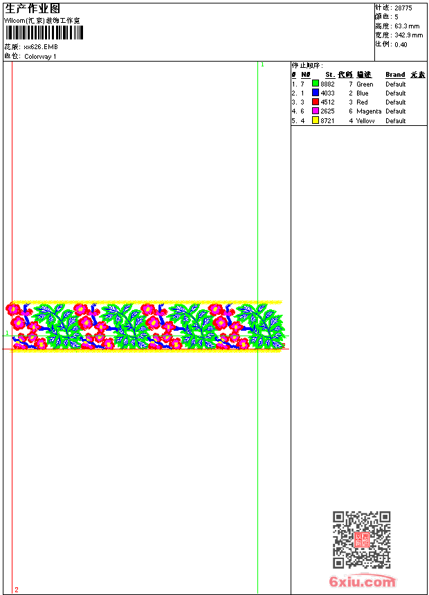 - emb花版参数: 大小:103.00 KB / 尺寸:343*63[毫米] / 针数:28775针 / 线色:5 / 格式:emb / 版本:9