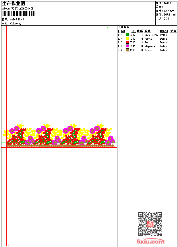 - emb花版参数: 大小:64.00 KB / 尺寸:348*74[毫米] / 针数:20728针 / 线色:5 / 格式:emb / 版本:9