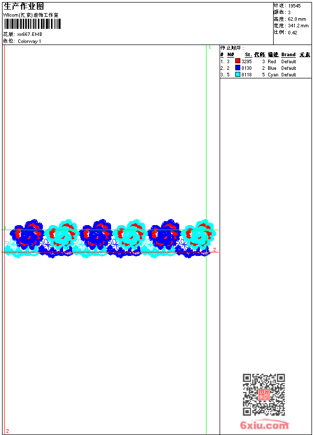 - emb花版参数: 大小:51.00 KB / 尺寸:341*62[毫米] / 针数:19545针 / 线色:3 / 格式:emb / 版本:9