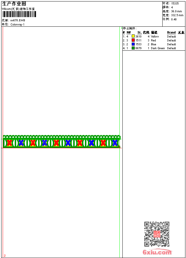 - emb花版参数: 大小:70.00 KB / 尺寸:332*36[毫米] / 针数:15335针 / 线色:4 / 格式:emb / 版本:9