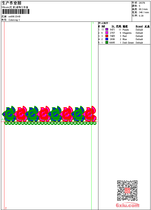 - emb花版参数: 大小:69.00 KB / 尺寸:340*68[毫米] / 针数:28376针 / 线色:5 / 格式:emb / 版本:9