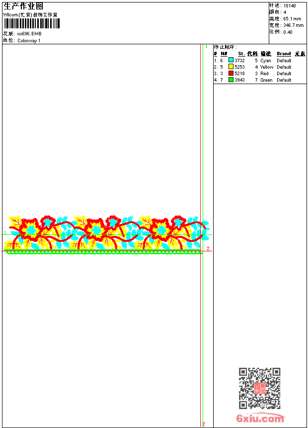 - emb花版参数: 大小:59.00 KB / 尺寸:347*65[毫米] / 针数:18148针 / 线色:4 / 格式:emb / 版本:9