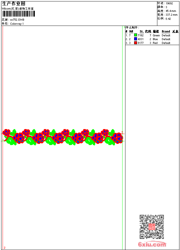 - emb花版参数: 大小:46.00 KB / 尺寸:337*45[毫米] / 针数:19692针 / 线色:3 / 格式:emb / 版本:9