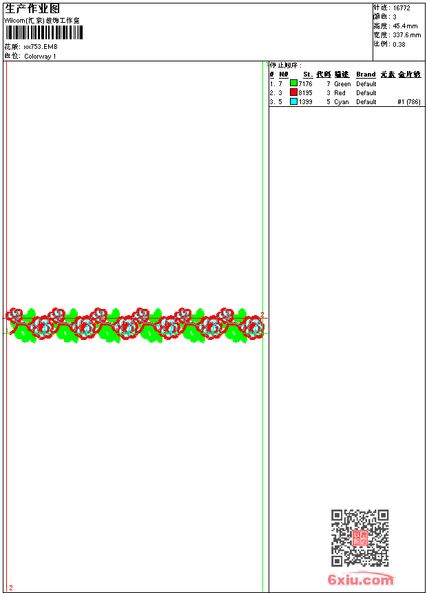 - emb花版参数: 大小:167.50 KB / 尺寸:338*45[毫米] / 针数:16772针 / 线色:3 / 格式:emb / 版本:9