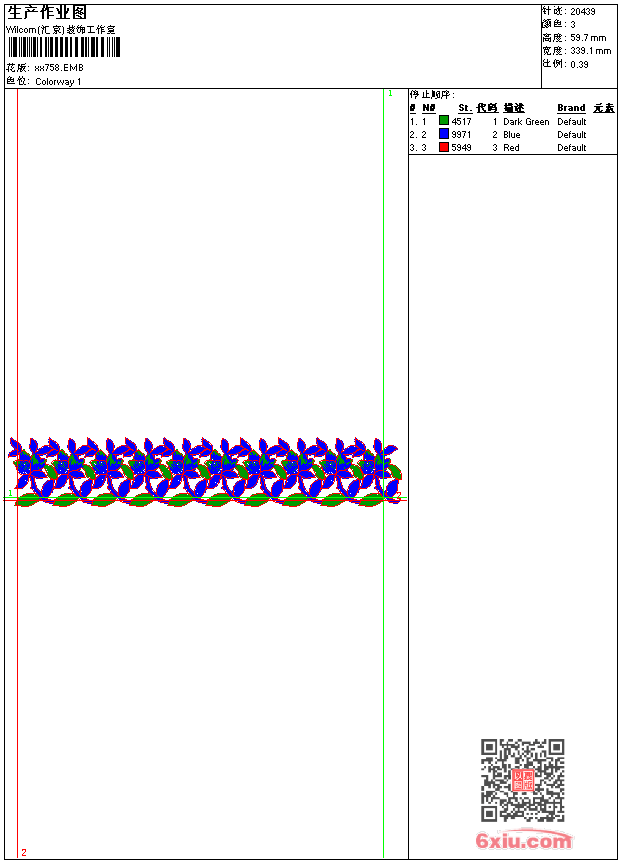 - emb花版参数: 大小:50.00 KB / 尺寸:339*60[毫米] / 针数:20439针 / 线色:3 / 格式:emb / 版本:9