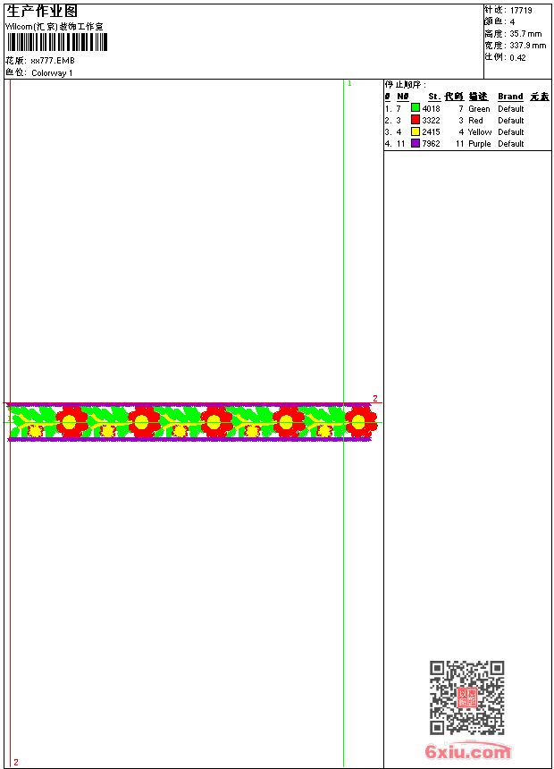 - emb花版参数: 大小:35.00 KB / 尺寸:338*36[毫米] / 针数:17719针 / 线色:4 / 格式:emb / 版本:9