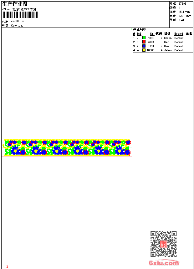 - emb花版参数: 大小:49.50 KB / 尺寸:338*45[毫米] / 针数:27996针 / 线色:4 / 格式:emb / 版本:9