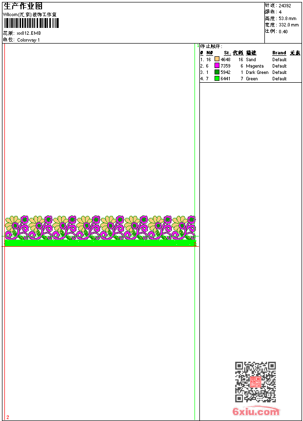 - emb花版参数: 大小:70.00 KB / 尺寸:332*54[毫米] / 针数:24392针 / 线色:4 / 格式:emb / 版本:9