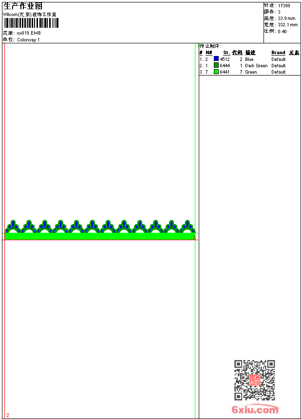 - emb花版参数: 大小:48.50 KB / 尺寸:332*34[毫米] / 针数:17399针 / 线色:3 / 格式:emb / 版本:9