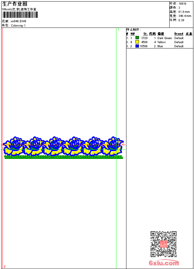 - emb花版参数: 大小:40.50 KB / 尺寸:340*62[毫米] / 针数:18816针 / 线色:3 / 格式:emb / 版本:9