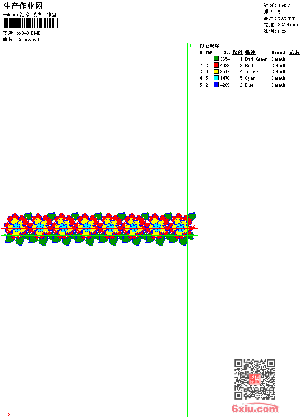 - emb花版参数: 大小:38.50 KB / 尺寸:338*60[毫米] / 针数:15957针 / 线色:5 / 格式:emb / 版本:9