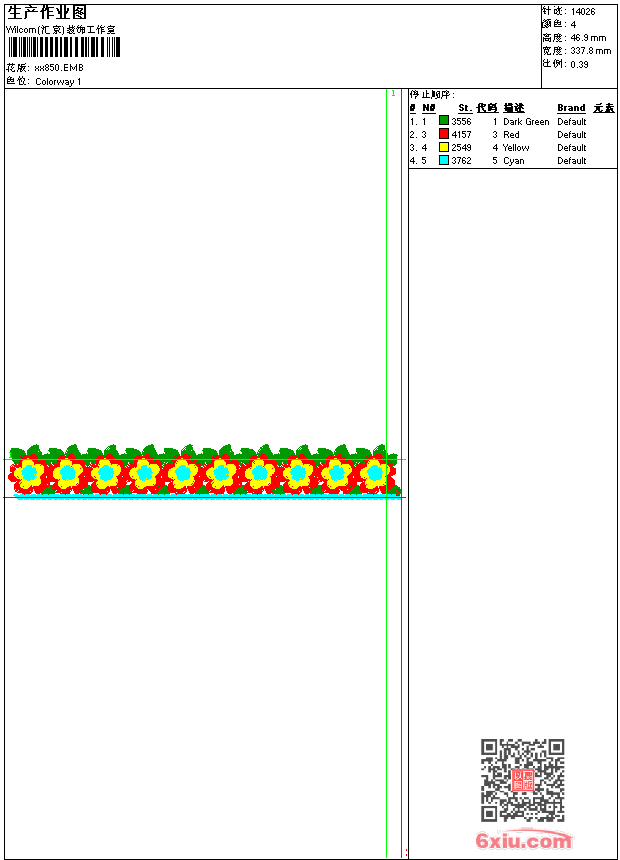 - emb花版参数: 大小:50.00 KB / 尺寸:338*47[毫米] / 针数:14026针 / 线色:4 / 格式:emb / 版本:9