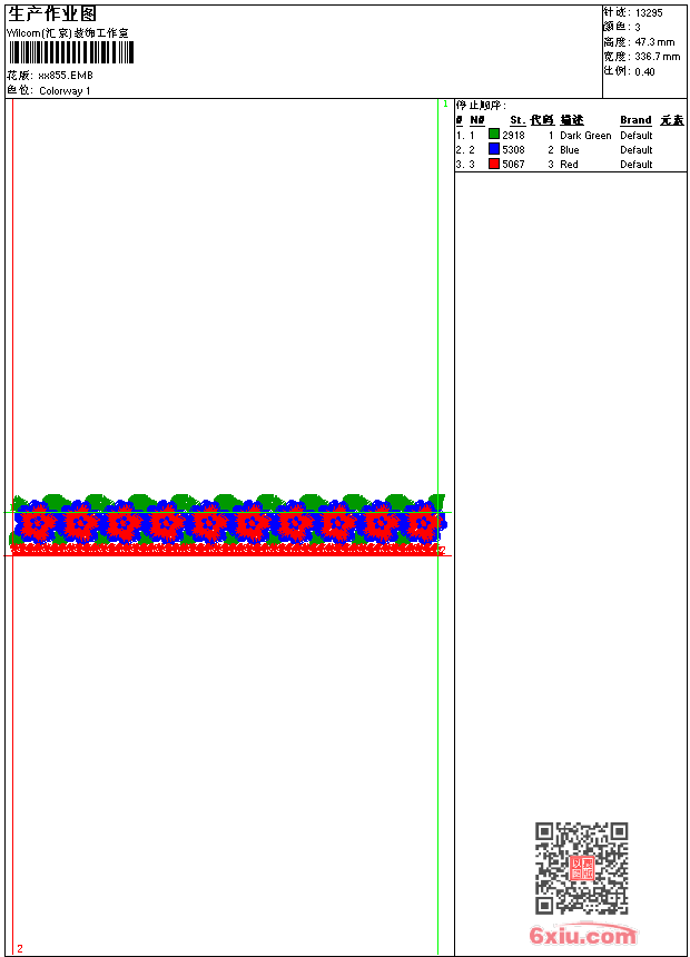 - emb花版参数: 大小:35.50 KB / 尺寸:337*47[毫米] / 针数:13295针 / 线色:3 / 格式:emb / 版本:9