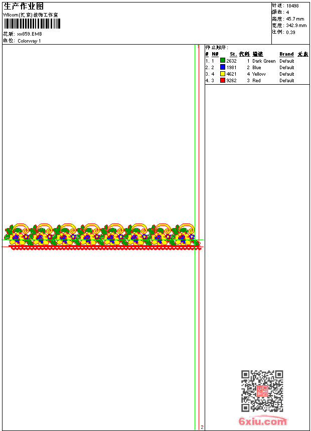 - emb花版参数: 大小:41.50 KB / 尺寸:343*46[毫米] / 针数:18498针 / 线色:4 / 格式:emb / 版本:9