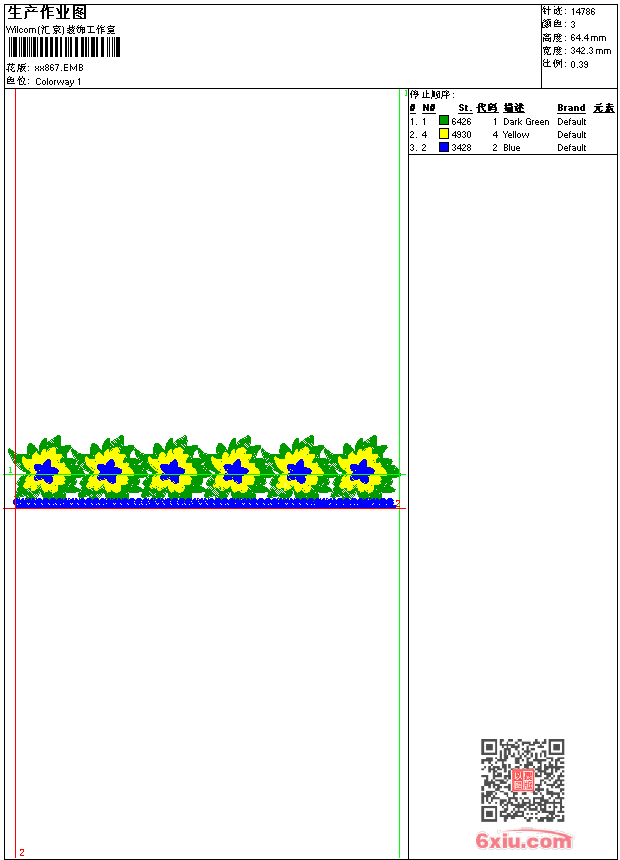 - emb花版参数: 大小:44.50 KB / 尺寸:342*64[毫米] / 针数:14786针 / 线色:3 / 格式:emb / 版本:9