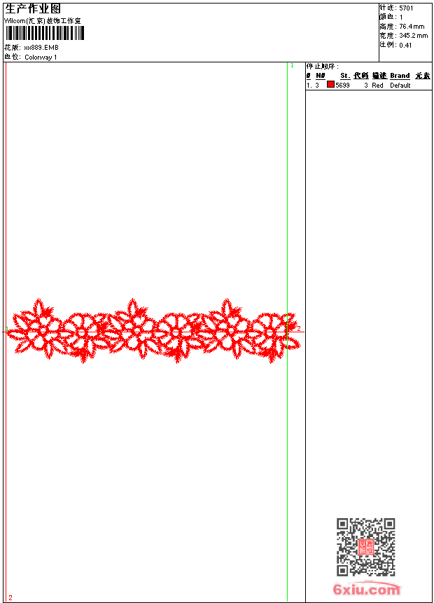 - emb花版参数: 大小:68.00 KB / 尺寸:345*76[毫米] / 针数:5701针 / 线色:1 / 格式:emb / 版本:9