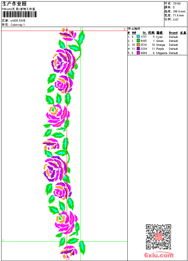 - emb花版参数: 大小:111.50 KB / 尺寸:72*387[毫米] / 针数:15100针 / 线色:5 / 格式:emb / 版本:9