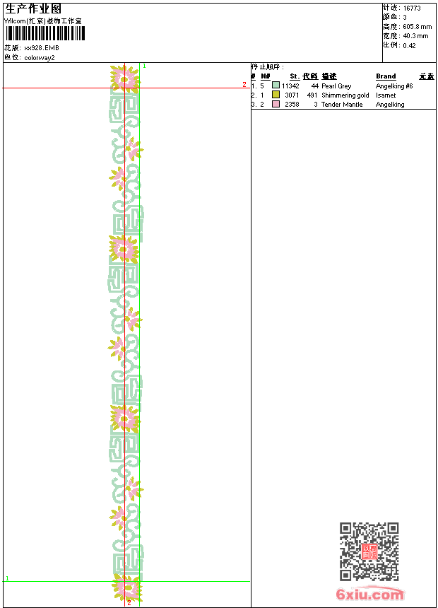 - emb花版参数: 大小:58.00 KB / 尺寸:40*606[毫米] / 针数:16773针 / 线色:3 / 格式:emb / 版本:9