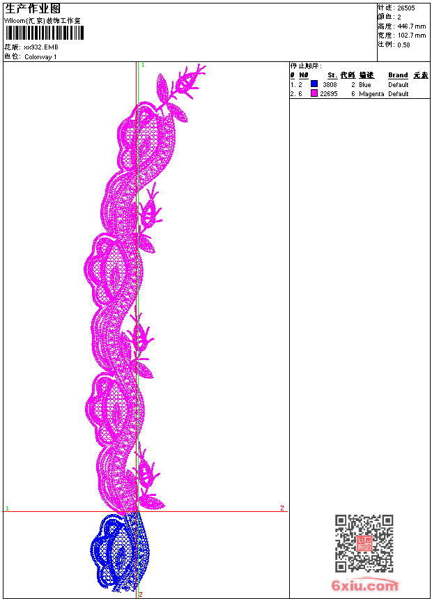 - emb花版参数: 大小:261.00 KB / 尺寸:103*447[毫米] / 针数:26505针 / 线色:2 / 格式:emb / 版本:9