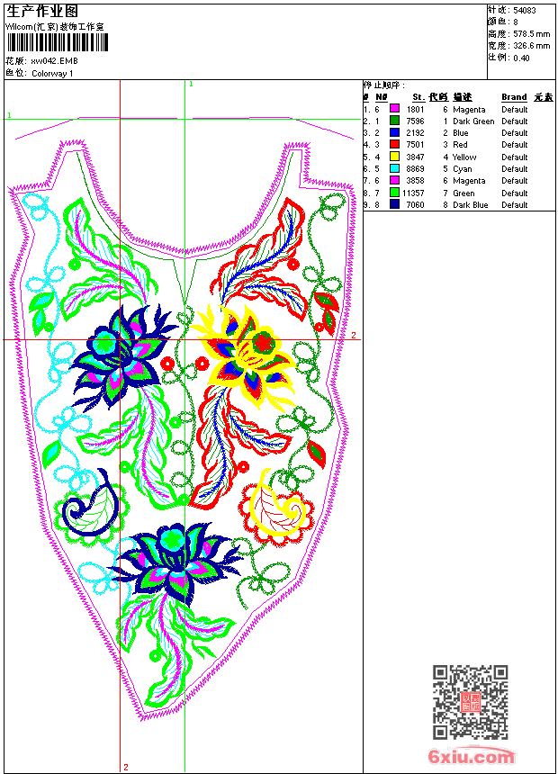 - emb花版参数: 大小:228.00 KB / 尺寸:327*579[毫米] / 针数:54083针 / 线色:8 / 格式:emb / 版本:9