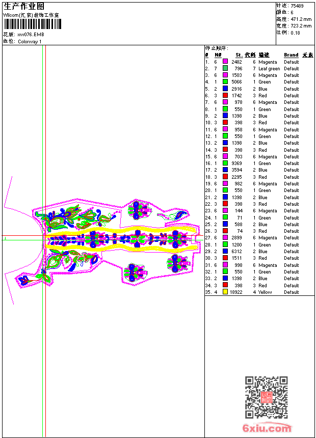 - emb花版参数: 大小:444.50 KB / 尺寸:723*471[毫米] / 针数:75489针 / 线色:6 / 格式:emb / 版本:9