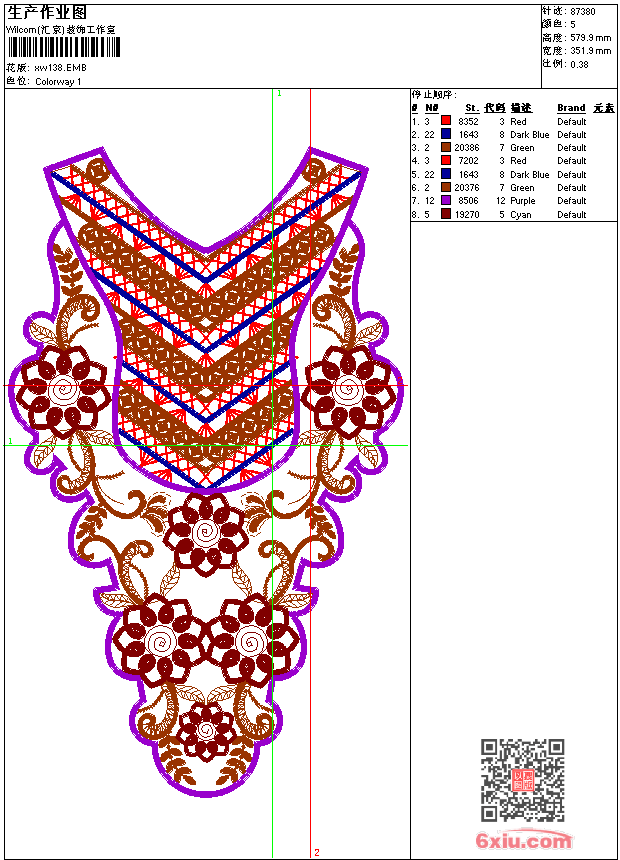 - emb花版参数: 大小:363.00 KB / 尺寸:352*580[毫米] / 针数:87380针 / 线色:5 / 格式:emb / 版本:9