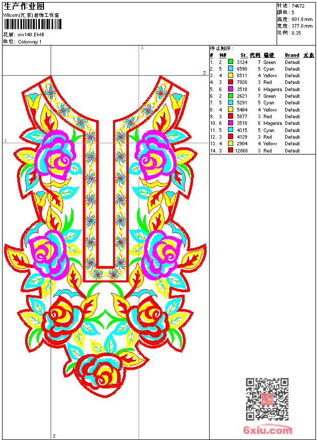 - emb花版参数: 大小:381.50 KB / 尺寸:377*602[毫米] / 针数:74672针 / 线色:5 / 格式:emb / 版本:9