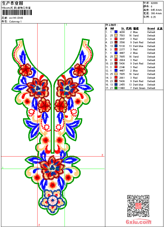 - emb花版参数: 大小:304.00 KB / 尺寸:300*645[毫米] / 针数:82899针 / 线色:6 / 格式:emb / 版本:9
