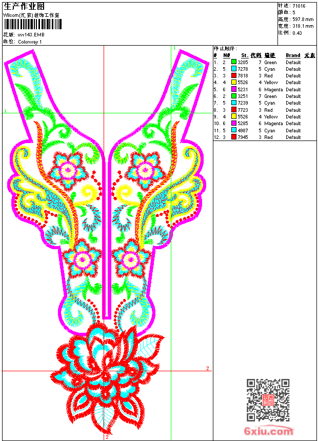 - emb花版参数: 大小:275.50 KB / 尺寸:318*598[毫米] / 针数:71016针 / 线色:5 / 格式:emb / 版本:9