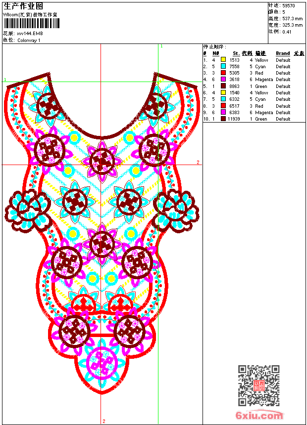 - emb花版参数: 大小:325.00 KB / 尺寸:325*537[毫米] / 针数:59570针 / 线色:5 / 格式:emb / 版本:9