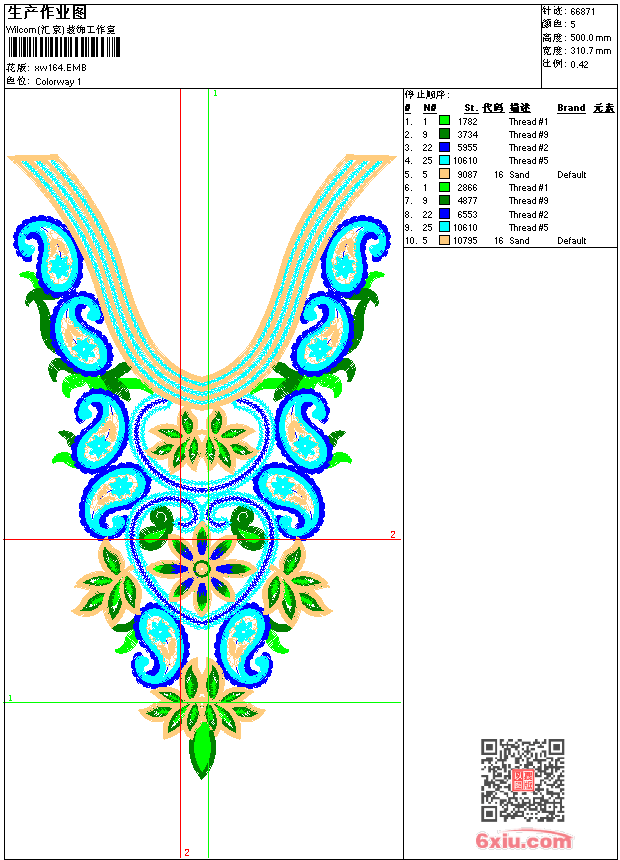 - emb花版参数: 大小:485.00 KB / 尺寸:311*500[毫米] / 针数:66871针 / 线色:5 / 格式:emb / 版本:9
