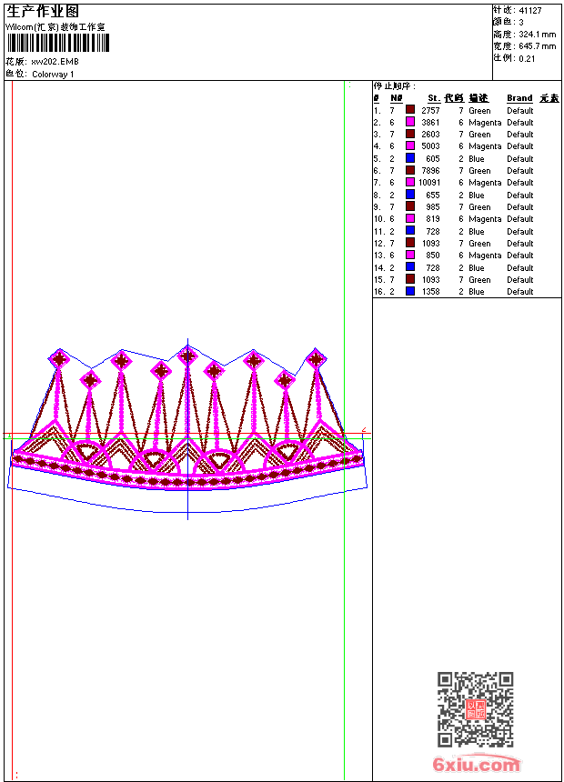 - emb花版参数: 大小:264.00 KB / 尺寸:646*324[毫米] / 针数:41127针 / 线色:3 / 格式:emb / 版本:9