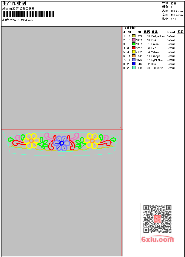 - emb花版参数: 大小:112.00 KB / 尺寸:433*107[毫米] / 针数:9796针 / 线色:9 / 格式:emb / 版本:9