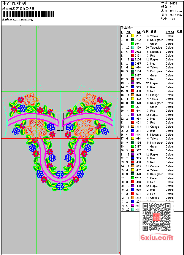 - emb花版参数: 大小:442.00 KB / 尺寸:454*429[毫米] / 针数:64152针 / 线色:9 / 格式:emb / 版本:9