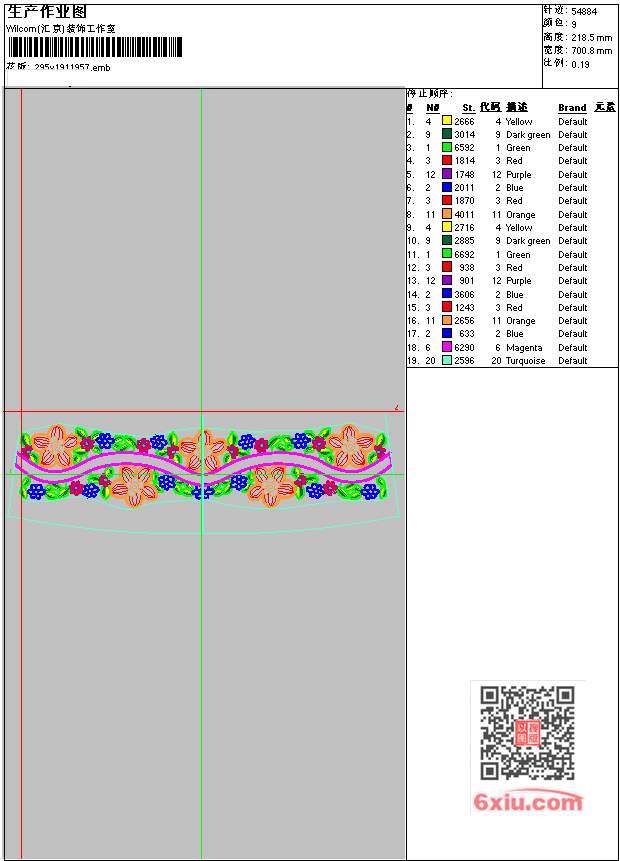 - emb花版参数: 大小:335.00 KB / 尺寸:701*219[毫米] / 针数:54884针 / 线色:9 / 格式:emb / 版本:9