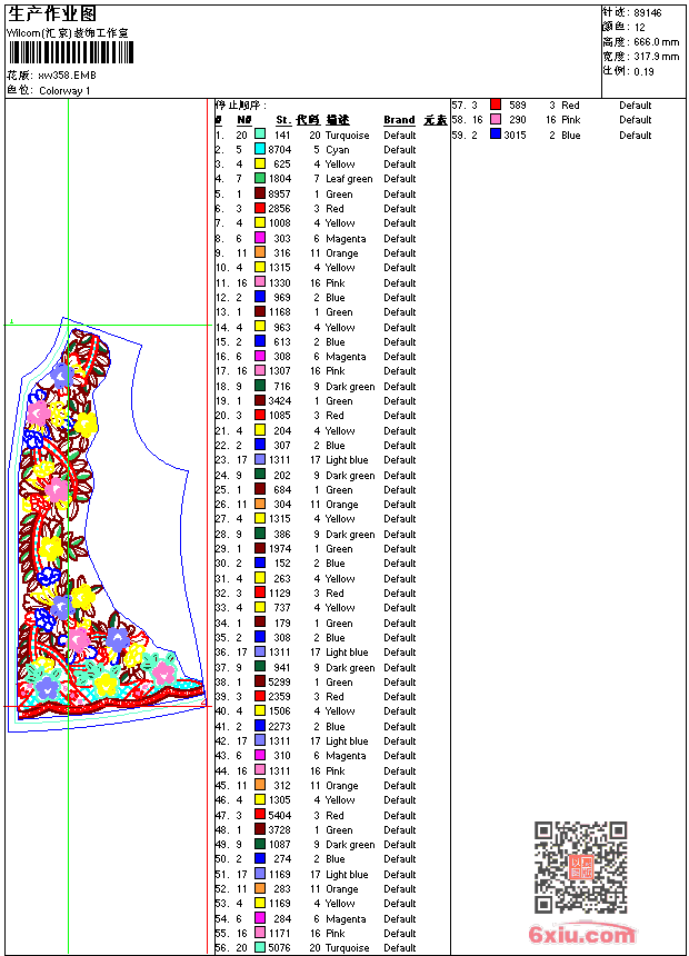 - emb花版参数: 大小:581.50 KB / 尺寸:318*666[毫米] / 针数:89146针 / 线色:12 / 格式:emb / 版本:9