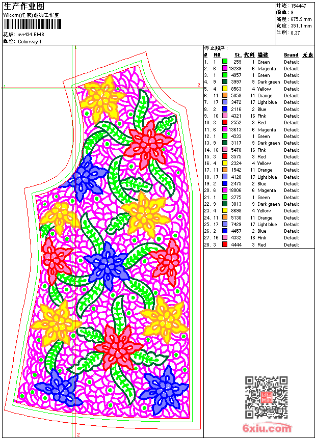 - emb花版参数: 大小:911.00 KB / 尺寸:351*676[毫米] / 针数:154447针 / 线色:9 / 格式:emb / 版本:9