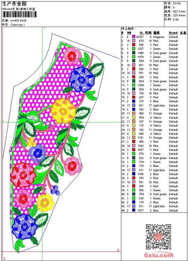 - emb花版参数: 大小:322.50 KB / 尺寸:225*423[毫米] / 针数:57170针 / 线色:9 / 格式:emb / 版本:9