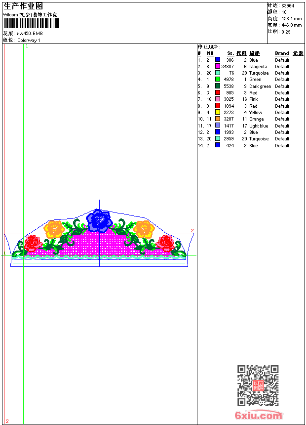 - emb花版参数: 大小:381.00 KB / 尺寸:446*156[毫米] / 针数:63964针 / 线色:10 / 格式:emb / 版本:9
