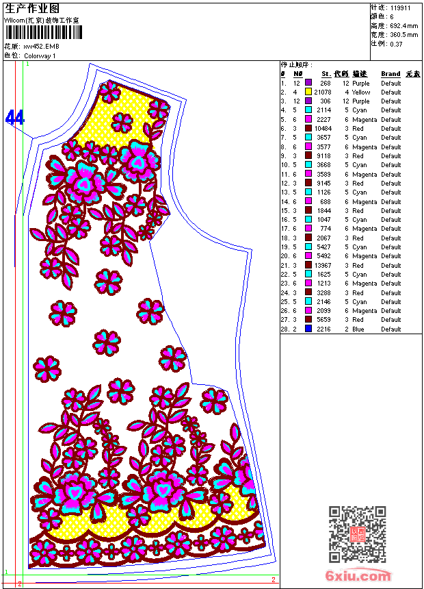 - emb花版参数: 大小:806.50 KB / 尺寸:361*692[毫米] / 针数:119911针 / 线色:6 / 格式:emb / 版本:9