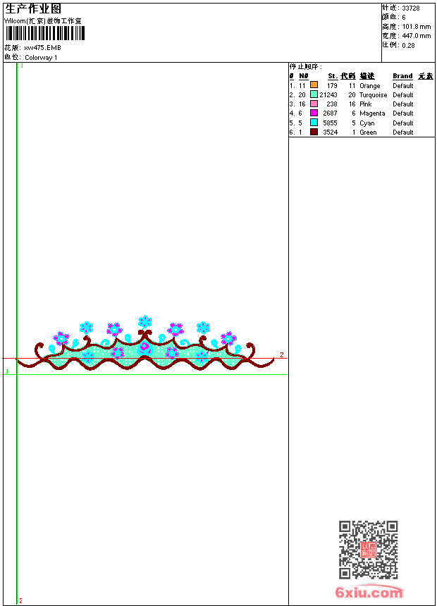 - EMB花版参数: 大小:182.00 KB / 尺寸:447*102[毫米] / 针数:33728针 / 线色:6 / 格式:EMB / 版本:9