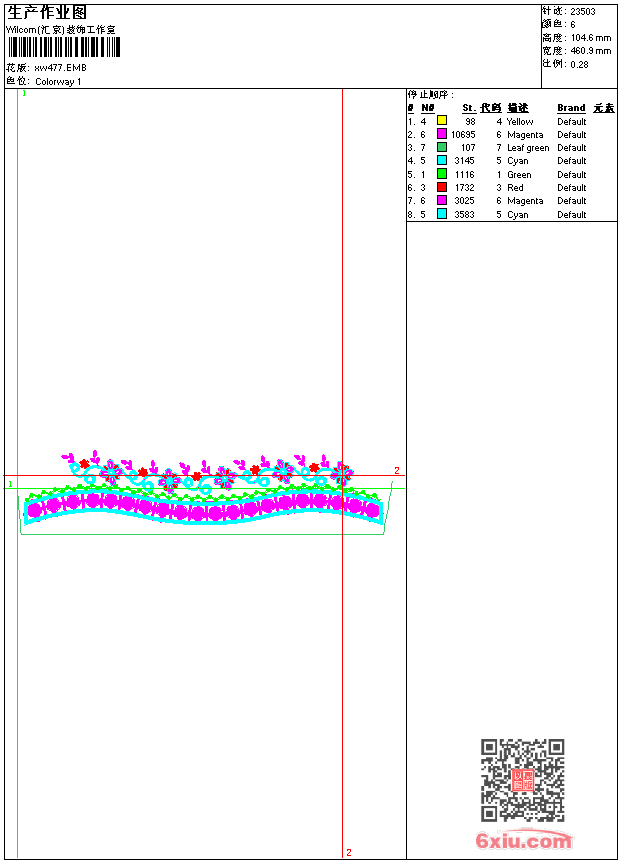 - EMB花版参数: 大小:168.50 KB / 尺寸:461*105[毫米] / 针数:23503针 / 线色:6 / 格式:EMB / 版本:9