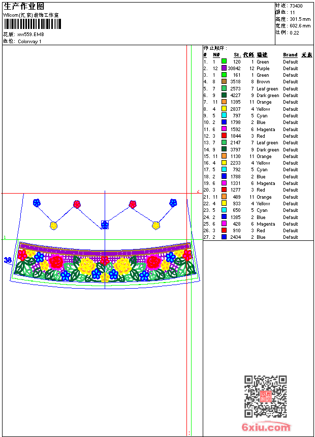 - emb花版参数: 大小:410.00 KB / 尺寸:603*302[毫米] / 针数:73430针 / 线色:11 / 格式:emb / 版本:9