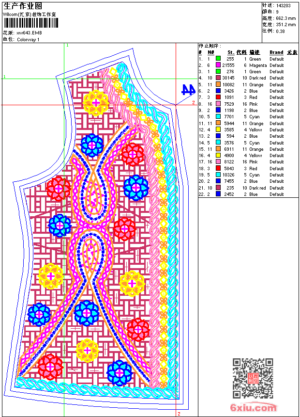 - emb花版参数: 大小:699.50 KB / 尺寸:351*662[毫米] / 针数:143203针 / 线色:9 / 格式:emb / 版本:9