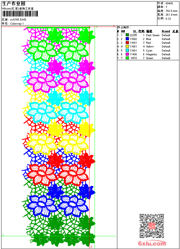 - emb花版参数: 大小:169.00 KB / 尺寸:262*783[毫米] / 针数:89430针 / 线色:7 / 格式:emb / 版本:9