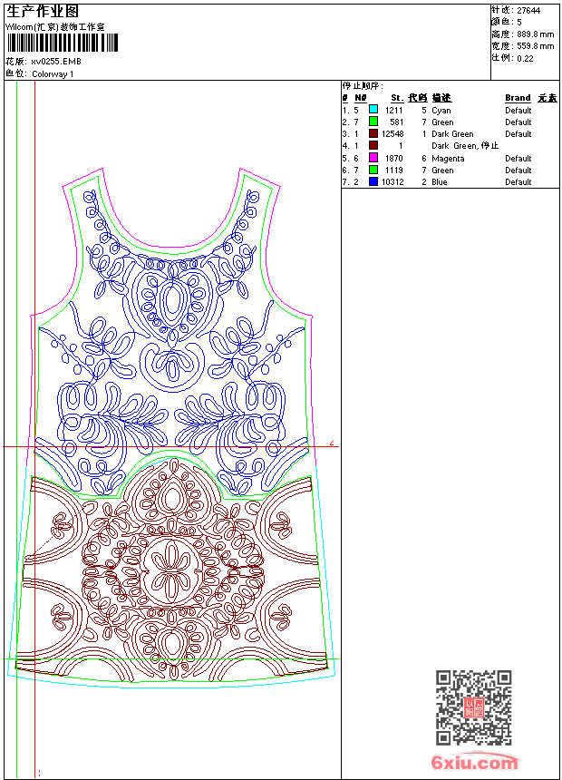 - emb花版参数: 大小:125.50 KB / 尺寸:560*890[毫米] / 针数:27644针 / 线色:5 / 格式:emb / 版本:9