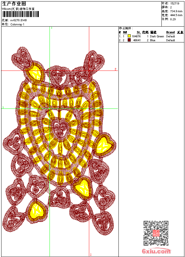 - emb花版参数: 大小:535.00 KB / 尺寸:445*735[毫米] / 针数:152719针 / 线色:2 / 格式:emb / 版本:9