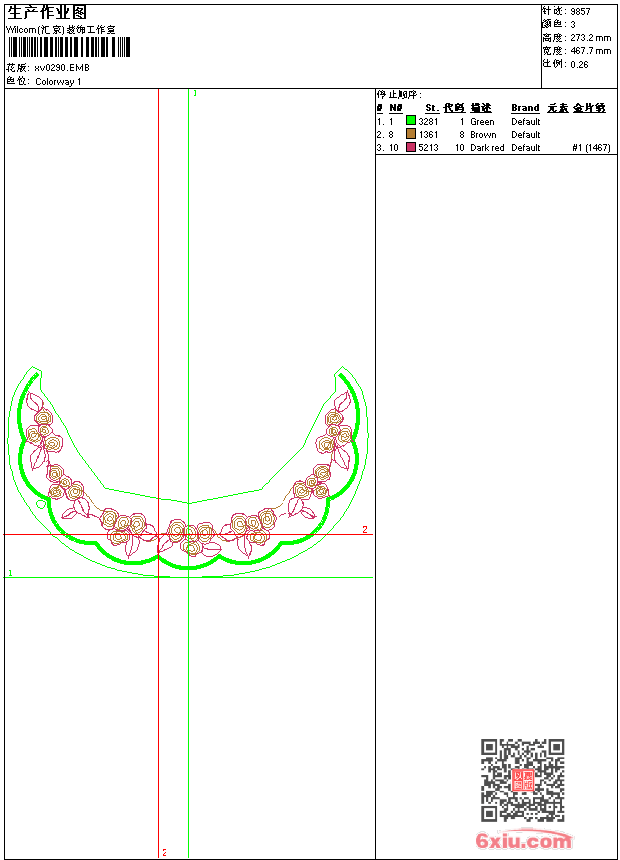 - emb花版参数: 大小:296.00 KB / 尺寸:468*273[毫米] / 针数:9857针 / 线色:3 / 格式:emb / 版本:9